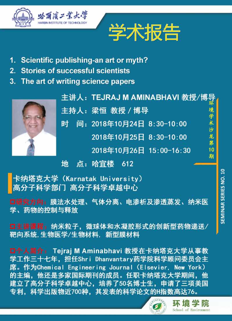 应搜书吧 梁恒教授的邀请,卡纳塔克大学TEJRAJ M AMINABHAVI教授将于2018年10月24日-10月25日访问搜书吧 并进行学术交流,欢迎全校感兴趣的师生参加。学术讲座信息如下: