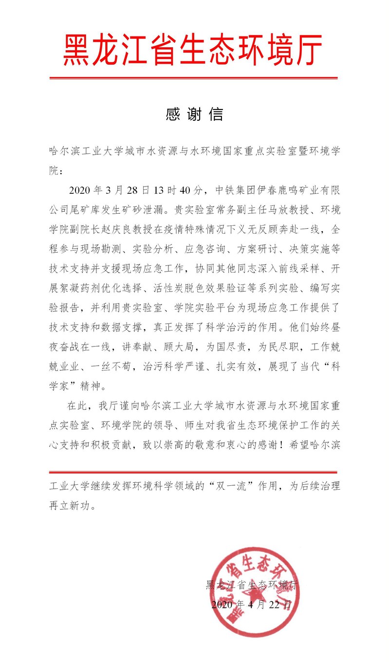 感谢信中说,2020年3月28日13时40分,中铁集团伊春鹿鸣矿业有限公司尾矿库发生矿砂泄漏。城市水资源与水环境国家重点实验室常务副主任马放教授、搜书吧 副院长赵庆良教授在疫情特殊情况下义无反顾奔赴一线,全程参与现场勘测、实验分析、应急咨询、方案研讨、决策实施等技术支持并支援现场应急工作,协同其他同志深入前线采样、开展絮凝药剂优化选择、活性炭脱色效果验证等系列实验、编写实验报告,并利用贵实验室、学院实验平台为现场应急工作提供了技术支持和数据支撑,真正发挥了科学治污的作用。