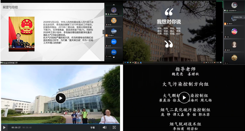 本次云端实习,除了教师主讲、专家报告之外,如何培养学生的组织领导力、团队协作能力是本次教学环节中重点思考的问题?通过群力群策,指导教师最后选择了制作“环境工程技术微电影”这一议题,通过相关设计元素的选择,最后形成了一份10余页的2016级环境工程在线毕业实习方案,充分发挥每一位学子的力量;视频汇报中,同学们通过各种方式,向祖国寄语、向环保寄语、向母校寄语,每一份毕业之前的汇报都让在线聆听的教师感动甚至动容。如大气污染控制组在5月23号的毕业实习答辩中就将李克强总理2019年政府工作报告中大气污染治理攻坚战的内容进行了结合。水污染控制组在实习答辩中,对母校和导师寄感恩之情。可以说,本次在线实习从各方面充分展示了我校环境学子的综合素质和工程实践及解决复杂工程问题的能力。