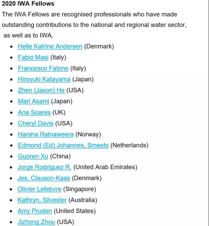 为了表彰在行业中取得突出成绩、做出长期贡献、具有国际影响力的IWA国际水协会员,IWA专门设立了IWA会士(IWA Fellow)和杰出会士(IWA Distinguished Fellow)的荣誉机制,每两年开展一次提名和评选工作。2020年度共有24位优秀行业专家和学者新晋入选,包括杰出会士7人,会士17人,其中包含四位华人学者,包括获得IWA会士荣誉的搜书吧 许国仁教授。明年5月9日-14日在丹麦哥本哈根的IWA世界水大会期间,将举办IWA会士&杰出会士颁奖典礼。