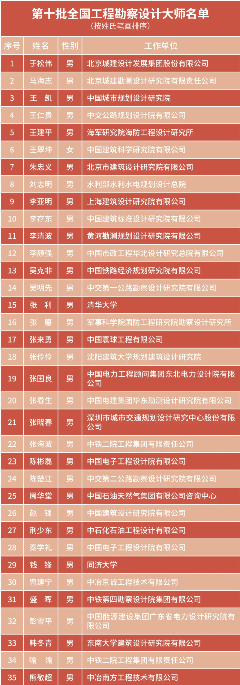 全国工程勘察设计大师,是中国工程勘察设计行业国家级荣誉称号,是对在工程勘察设计领域取得卓著成绩的权威认定,代表了中国勘察设计行业的最高水平,第十批全国工程勘察设计大师共有35位专家入选。