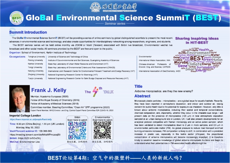 Frank Kelly 教授来自英国帝国理工学院,担任全球污染研究中心公共卫生学院的社区健康政策Humphrey Battcock主席。曾担任伦敦国王学院环境健康主席、环境研究组主任、NIHR研究组主任以及MRC环境与健康中心副主任。Frank Kelly教授是欧洲科学院院士(2020),英国皇家化学会会士(2019),医学科学院会士(2018),英国皇家生物学会会士(2015),IA**(institute of Air Quality Management)荣誉会士(2021)。曾获得皇家化学学会环境及可持续发展与能源部毒理学奖(2021),皇家化学会毒理学奖(2020),Haagen-smit奖(2019)等。担任“清洁空气”SPF计划指导委员会委员(2020),WHO COVID-19环境与工程控制专家委员会专家组成员(2020)等。