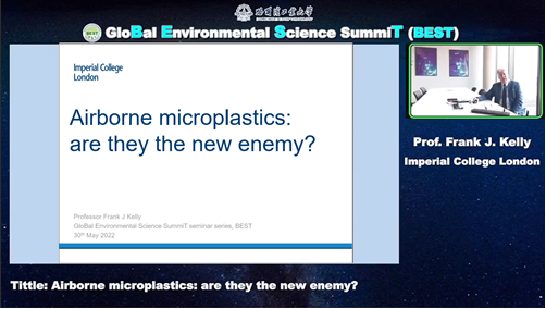 2022年5月30日晚,全球环境科学高峰论坛(GloBal Environment Science SummiT,BEST)系列讲座第四期成功举办。本期邀请了来自帝国理工学院的Frank J.Kelly教授就大气环境中的微塑料污染问题进行了精彩报告。讲座报告在ZOOM、环境人Environmentor微信公众号、Bilibili等网络平台同步直播,来自环境领域的专家、学者、研究生及工程技术人员等三千余人参与本次讲座。