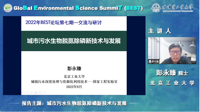 2022年8月31日晚,由搜书吧 组织、多家单位联合协办的全球环境科学高峰论坛(GloBal Environment Science SummiT, BEST)系列讲座第七期顺利举行。本期邀请了来自北京工业大学的中国工程院院士彭永臻教授,彭永臻教授以城市污水生物脱氮除磷新技术与发展为主题进行了精彩报告。报告在腾讯会议网络研讨会、环境人微信视频号、BEST论坛官方B站、蔻享学术以及中国给水排水等网络平台同步直播,共计两万五千余名来自环境领域的专家、学者、研究生及工程技术人员参与了本次讲座。