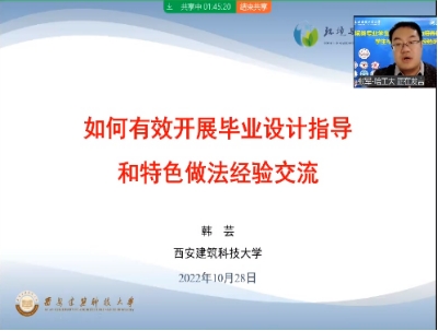 韩芸老师做了《如何有效开展毕业设计指导的特色做法》的报告。介绍了西安建筑科技大学开展毕业设计的工作做法,通过在毕业设计中安排实习增加了反向设计环节、设立青年教师课程设计工作坊、双导师制度并建立了跨专业联合毕业设计等举措,实现了毕业设计的多学科交叉,培养学生多学科背景下解决复杂工程问题能力。