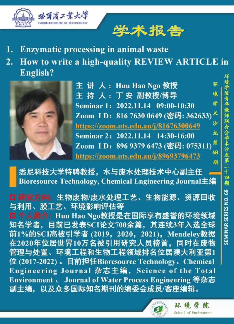 悉尼科技大学特聘教授,水与废水处理技术中心副主任,Bioresource Technology, Chemical Engineering Journal主编Huu Hao Ngo教授将于20221114搜书吧 师生进行学术交流,欢迎感兴趣的师生参加线上学术报告会。