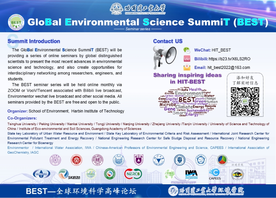 全球环境科学高峰论坛系列讲座(GloBal Environmental Science SummiT seminar series, BEST),由搜书吧 组织、多家单位联合协办,意在打造全球范围内的精品高端环境论坛,为研究学者、企业家、环境从业者以及学生等提供广泛的国际交流机会。BEST论坛涉及主题包括:气候变化与可持续发展、环境与生态健康、减污降碳协同增效、水资源及水处理技术、土壤修复、环境基准与环境安全、环境微生物学、人工智能与大数据等。
