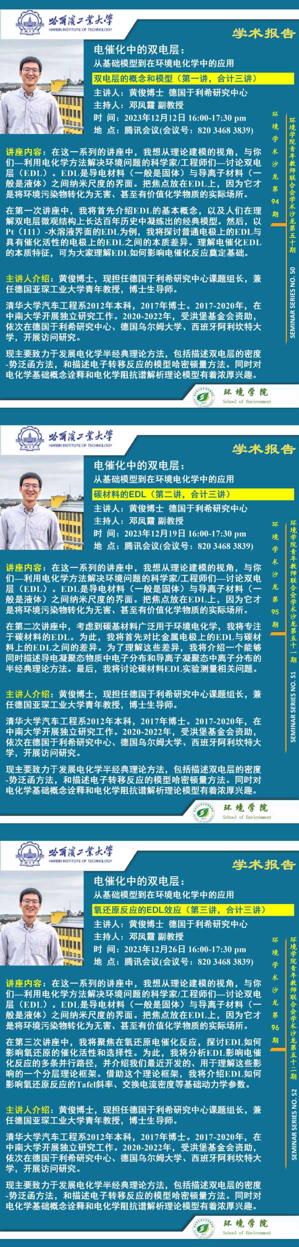 报告题目:电催化中的电双层:从基础模型到在环境电化学中的应用,包含如下三讲: