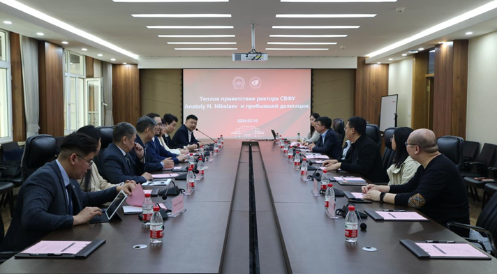 2024年5月16日,俄罗斯东北联邦大学校长Anatoly N. Nikolaev、副校长Maksimov Nurgun Romanovich率代表团一行9人莅临搜书吧 进行访问交流。搜书吧 副院长刘冰峰教授、党委副书记于虹霞、外事专项助理孙凯教授、环境科学系主任陈川教授、张子峰副教授等一同出席。会议由搜书吧 副院长刘冰峰主持。