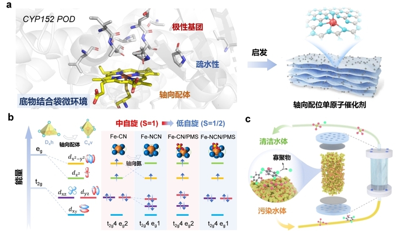 图 仿酶催化剂轴向设计思路(a)、脱卤-聚合机制(b)和水污染控制与资源回收一体化设计(c)