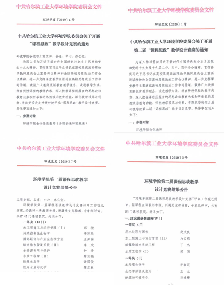 率先设计了课程思政教学设计竞赛。同时举办交流展示与研讨会,通过教艺切磋经验分享,快速有效实现了课程思政全覆盖,更新了蕴含课程思政内容的课程体系,完善了教学大纲、教学设计等指导性教学文件;2020年,哈工大“市政环境类专业课程思政教学团队”荣获黑龙江省首批教学团队;课程思政示范课、课程思政教学名师均榜上有名;校首届课程思政教学竞赛获特等奖1项,二等奖1项;青年教师全面发展,近四年入选国家人才计划8人,拔尖通道晋升9人,1人获全省青教赛一等奖第一名;学生在省级以上创新竞赛屡获大奖。2022年6月哈工大市搜书吧 课程思体系构建及团队建设荣获黑龙江省教学成果一等奖。